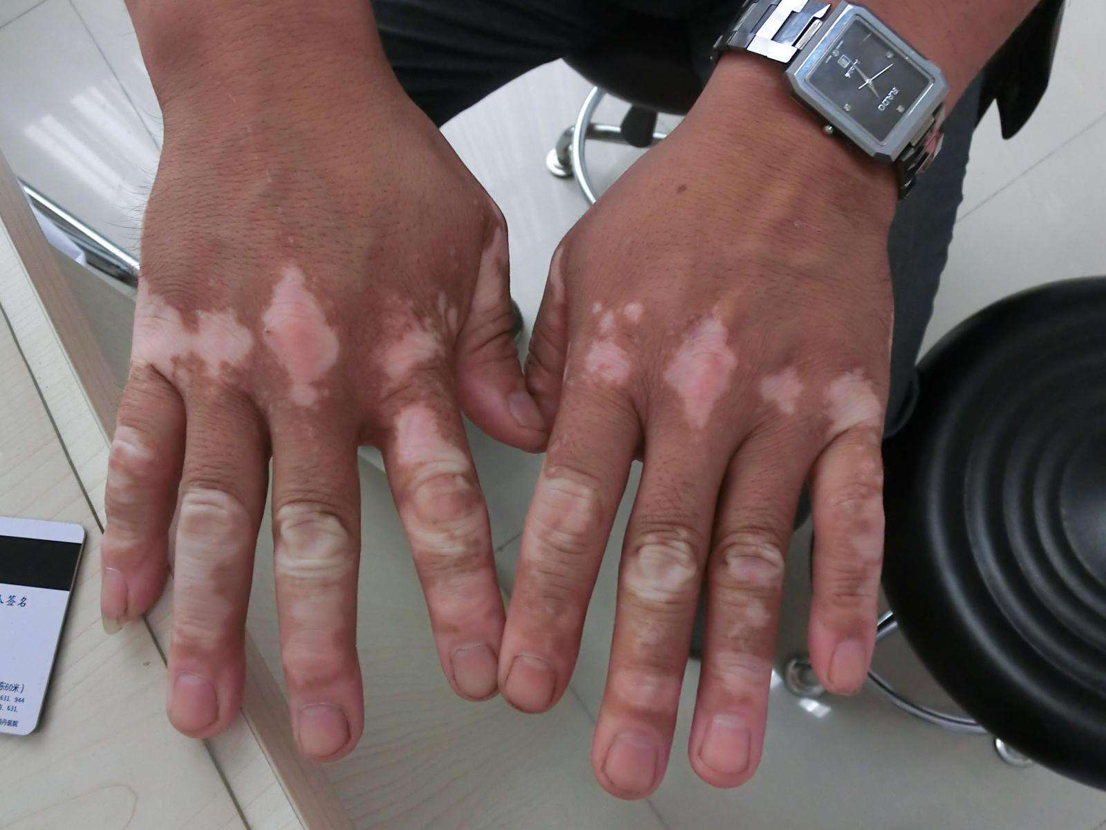 混合型、节段型、面部肢端型或寻常型:白斑主要为混合分布。